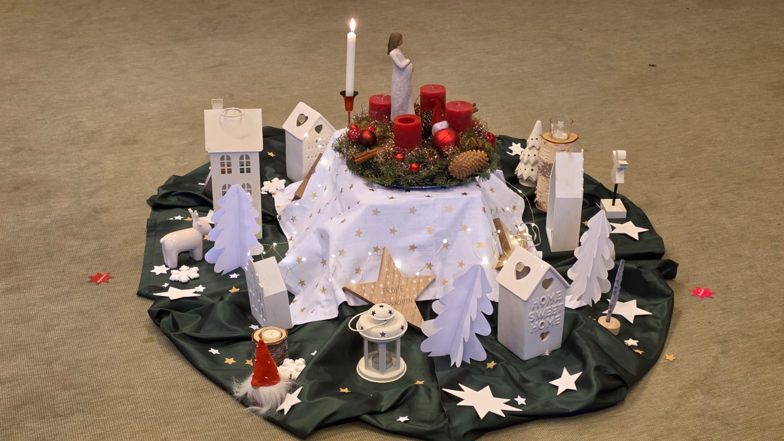 Die Dekoration in der Mitte des Raumes mit winterlich weißen Häusern und Bäumen, festlich erleuchtet, trug sicherlich auch dazu bei. Die schwangere Maria im Adventskranz wies uns auf die besondere Zeit im Jahr hin.